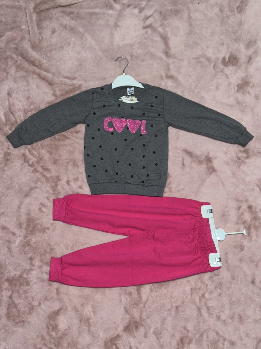 Takım, gri ve fuşya renklerin harika uyumuyla dikkat çekmektedir.