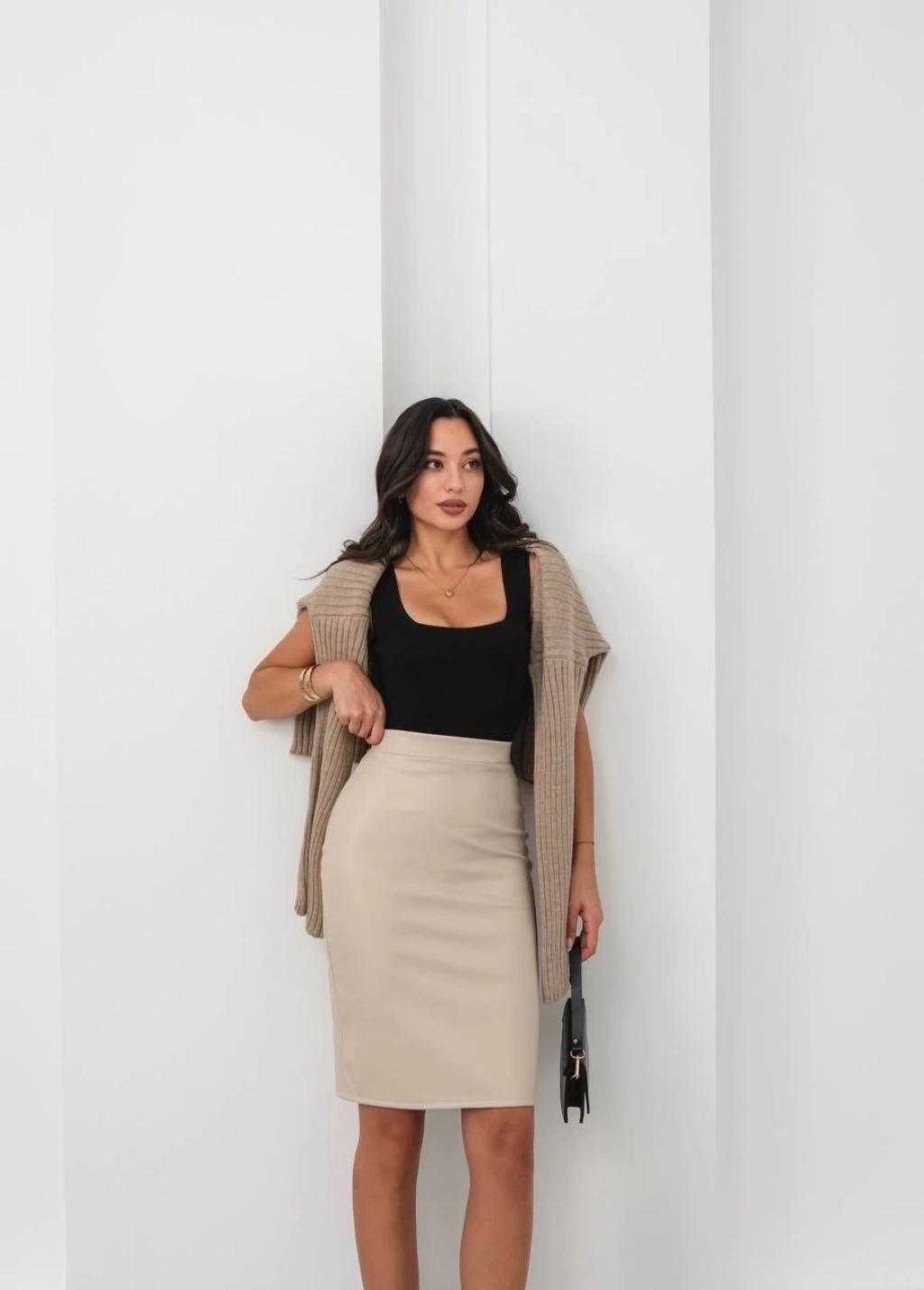 Arkadan yırtmaçlı kalem etek bej, şıklığı ve zarafeti bir arada sunar. Hem günlük kullanıma uygun hem de özel davetlerde tercih edilebilecek bir parçadır.