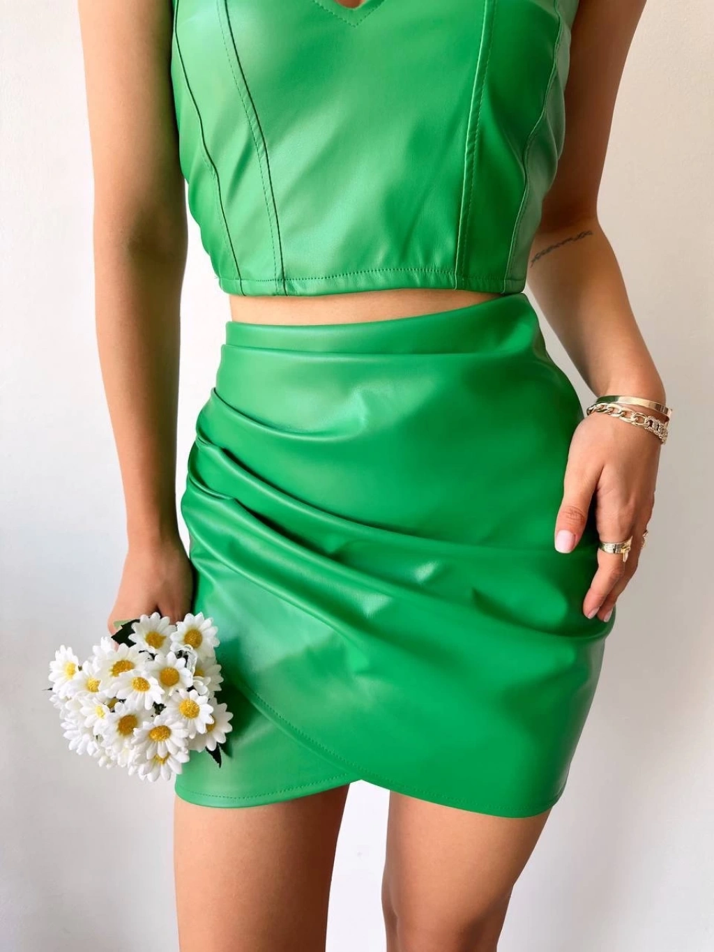 Derinin şıklığı ile Drapeli Deri Etek Yeşil S24771, kadınların gardırobunda fark yaratacak bir parça. Kaliteli deri malzemesi ve detaylarıyla göz kamaştıran bu etek, şıklığı ve rahatlığı bir arada arayanların tercihi olacak.