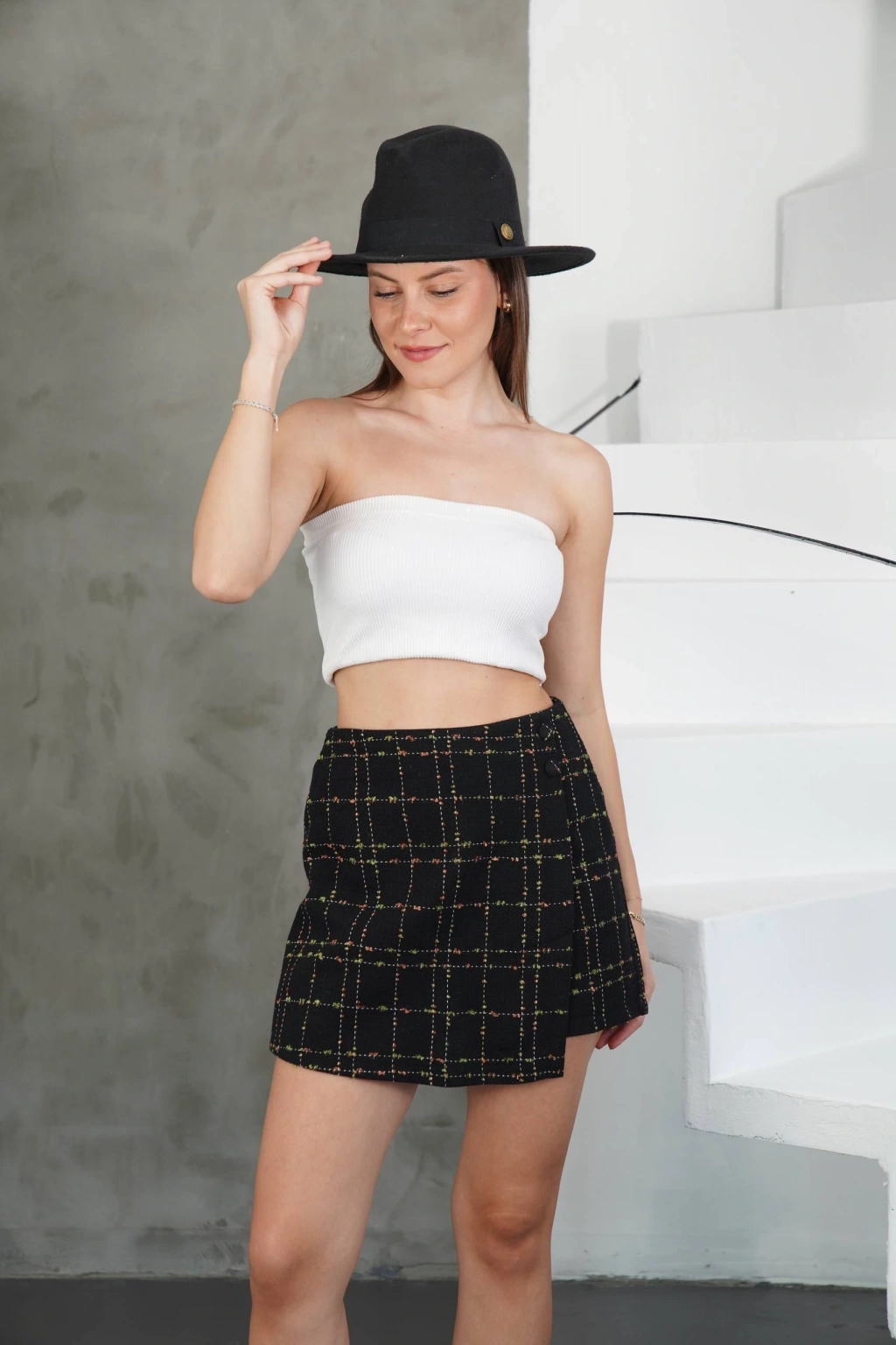 Kadınların şıklığına şıklık katan siyah renkli İki düğmeli şort etek, gardırobunuzun vazgeçilmezi olmaya aday!