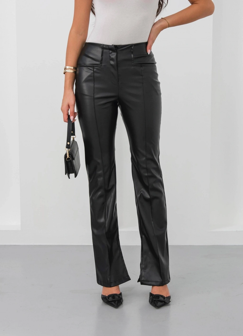İspanyol yırtmaçlı paça deri pantolon siyah hn, hem günlük hayatta hem de özel günlerde şıklığınızı tamamlamak için ideal bir seçimdir. Sizin de gardırobunuzda mutlaka bulunması gereken bir parça!