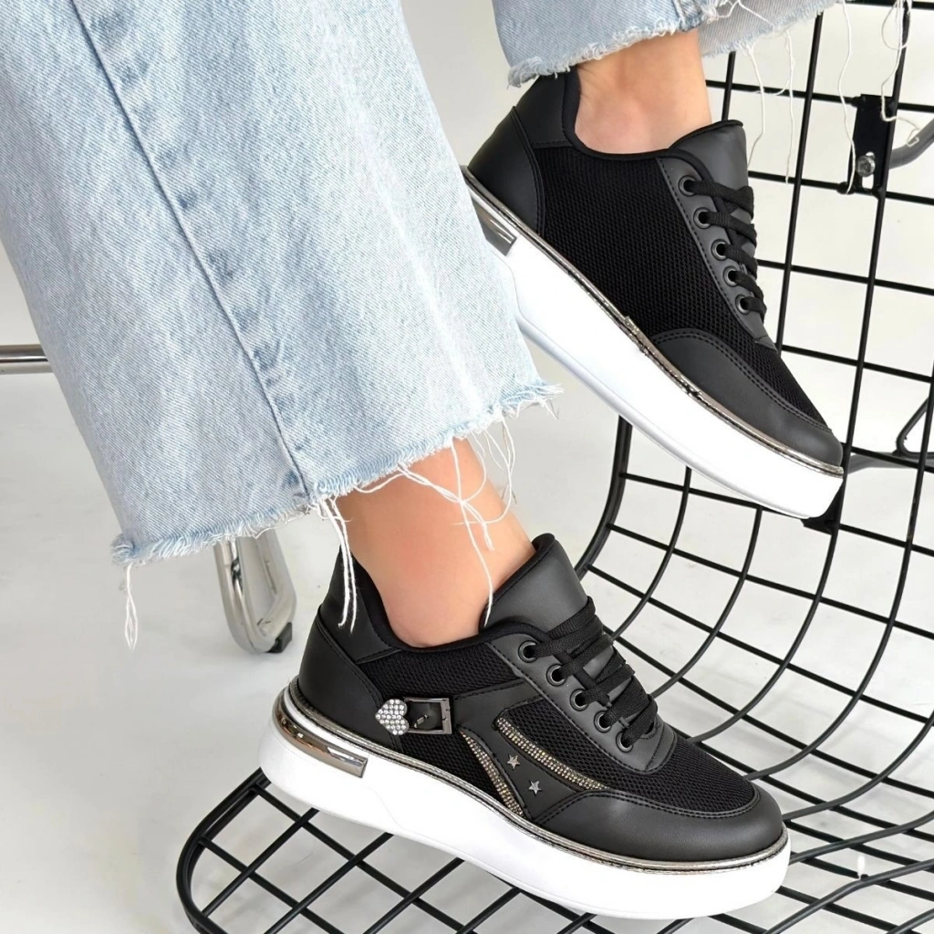 Junda Siyah Cilt Bağcıklı Spor Ayakkabı