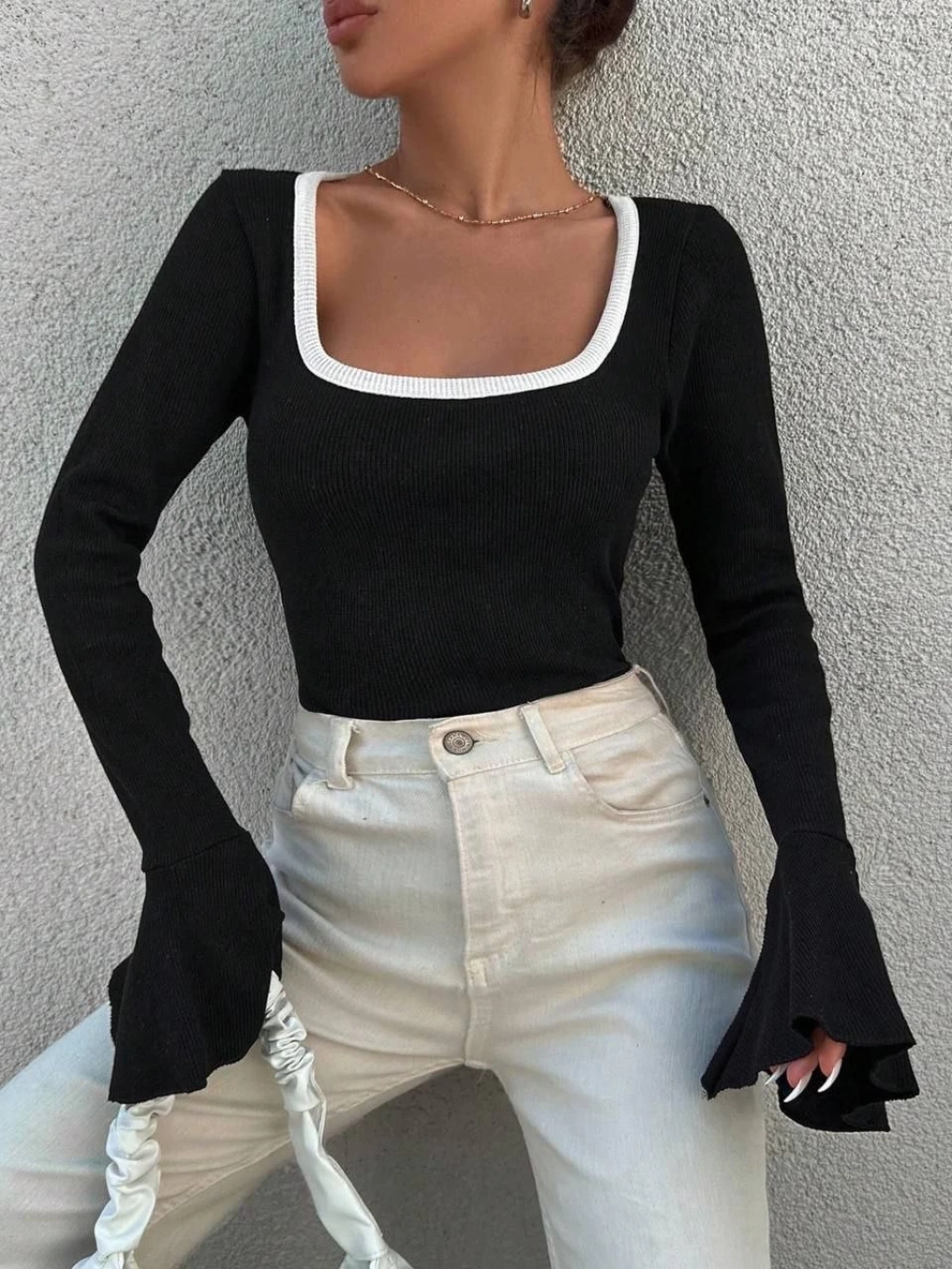 Kare yaka tasarımıyla modern bir görünüm sunar.