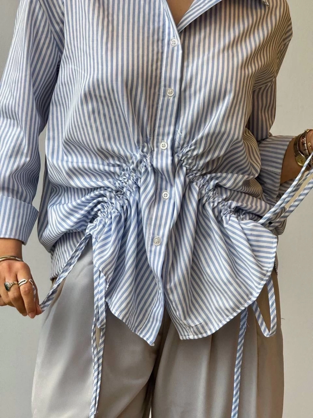 Önü büzgü detaylı çizgili gömlek, şıklığı ve rahatlığı bir arada sunuyor.