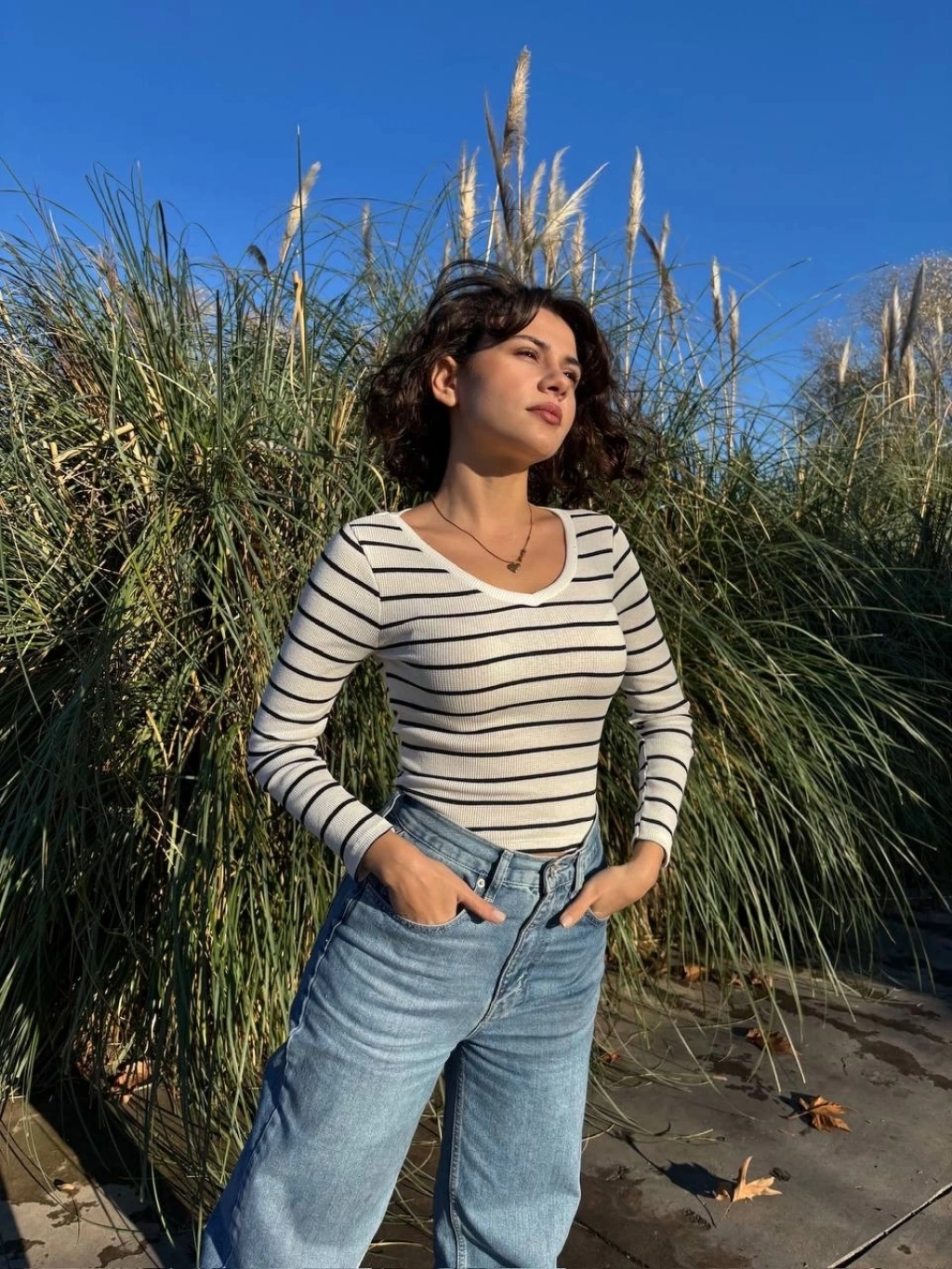 Kadın bluz modasının öncüsü olmaya aday olan beyaz V yaka çizgili bluzu hemen sepetinize ekleyin!