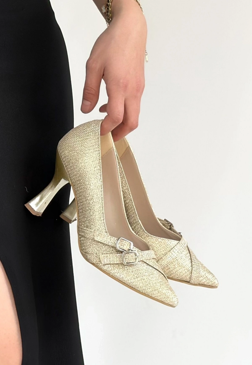 Wenda Gold Simli Cilt Topuklu Ayakkabı
