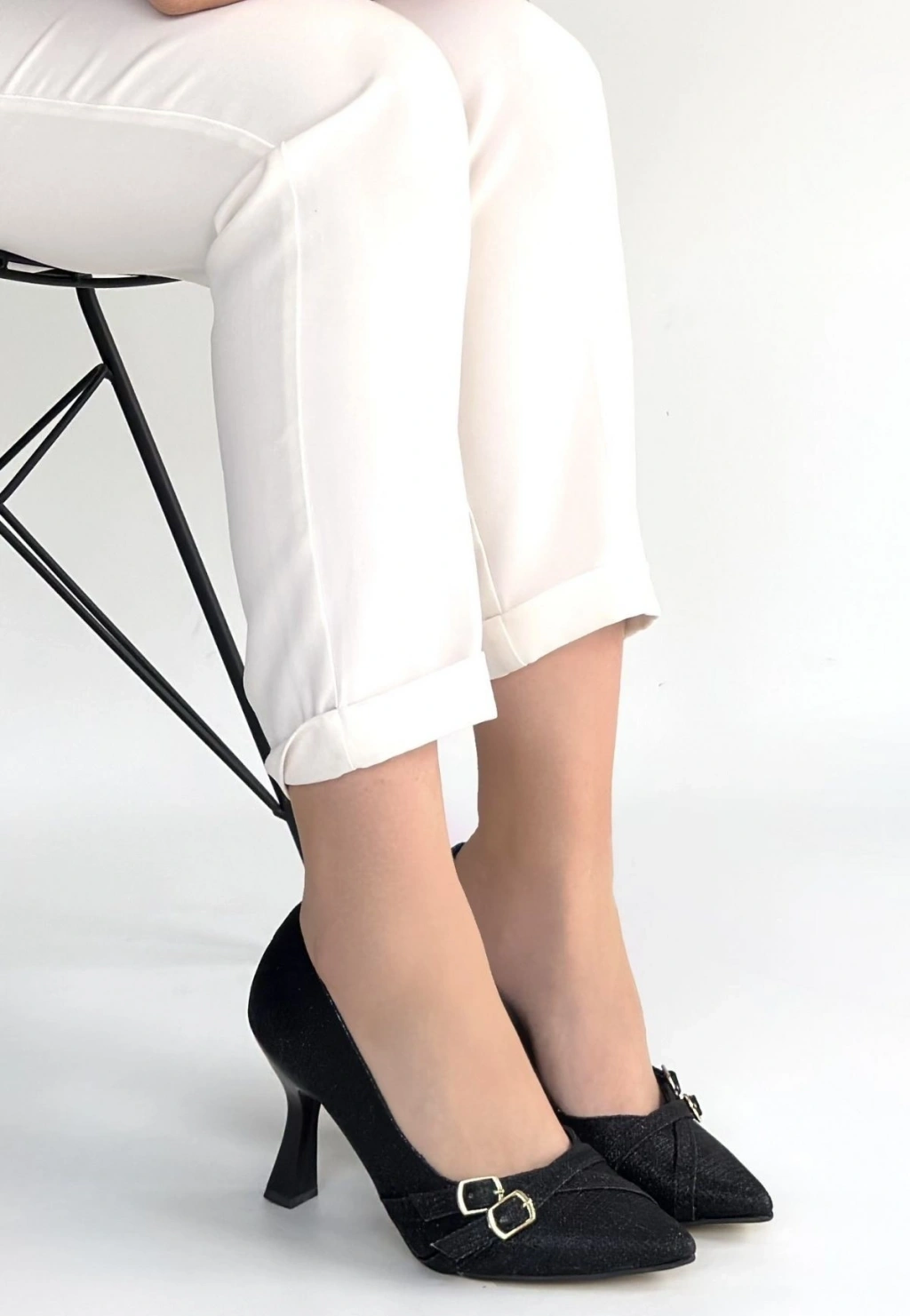 Wenda Siyah Simli Cilt Topuklu Ayakkabı
