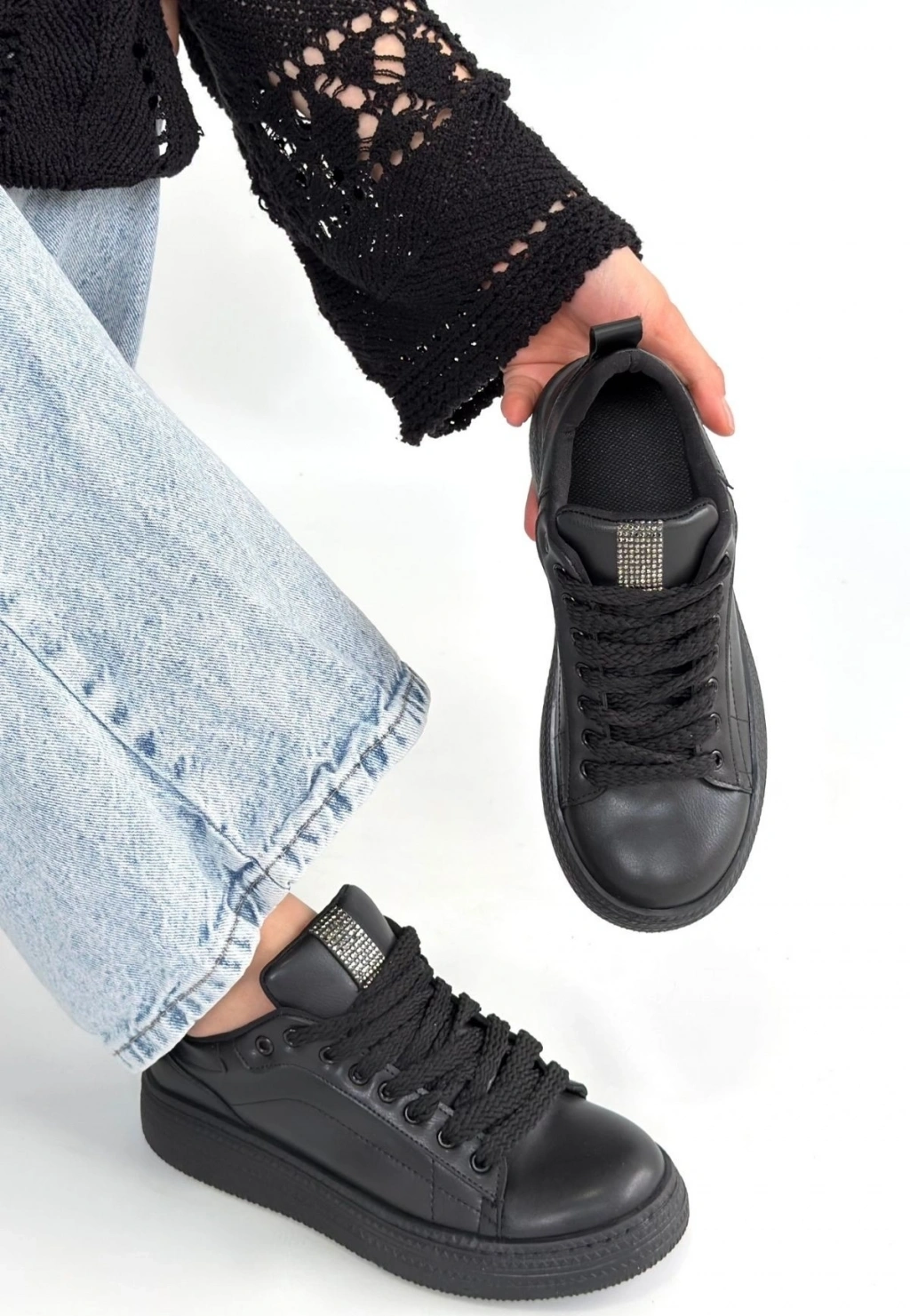 Yier Siyah Cilt Bağcıklı Spor Ayakkabı
